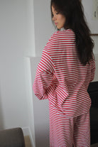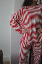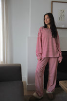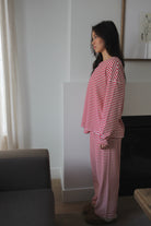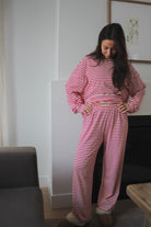 The Lounge Set redefines pajama comfort with a stylish twist, making it perfect for both lounging at home and going out. The versatile top pairs beautifully with jeans for a casual look, while the bottoms complement a rich cream knit sweater effortlessly. Designed to combine comfort and elegance, this set is poised to be your holiday wardrobe’s standout piece.