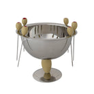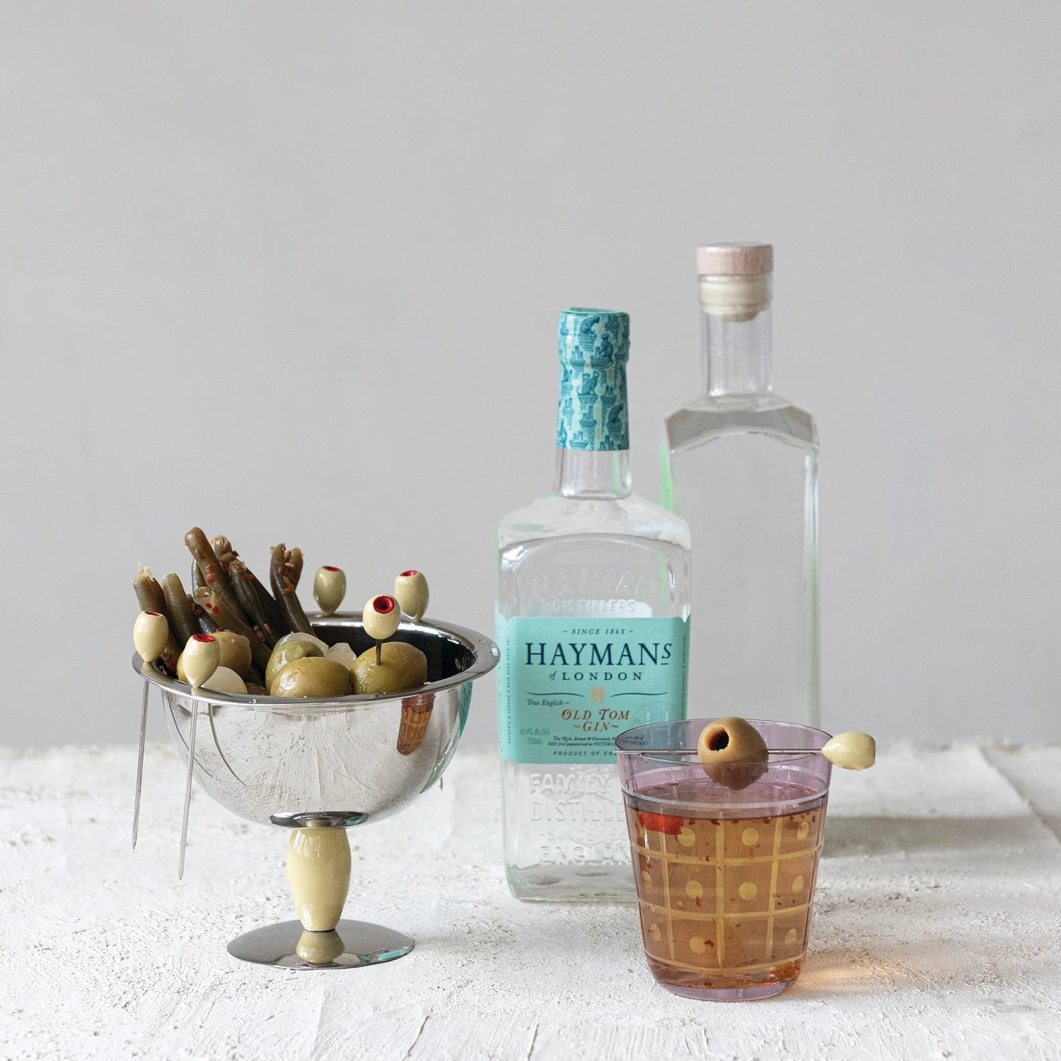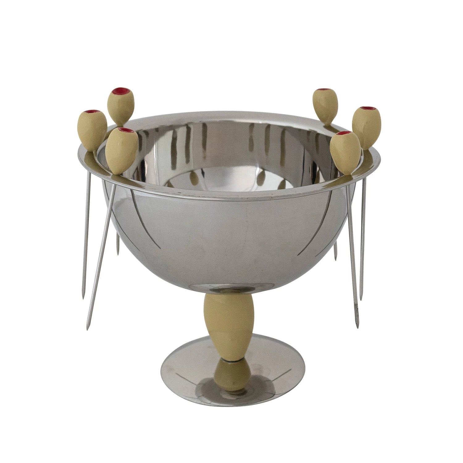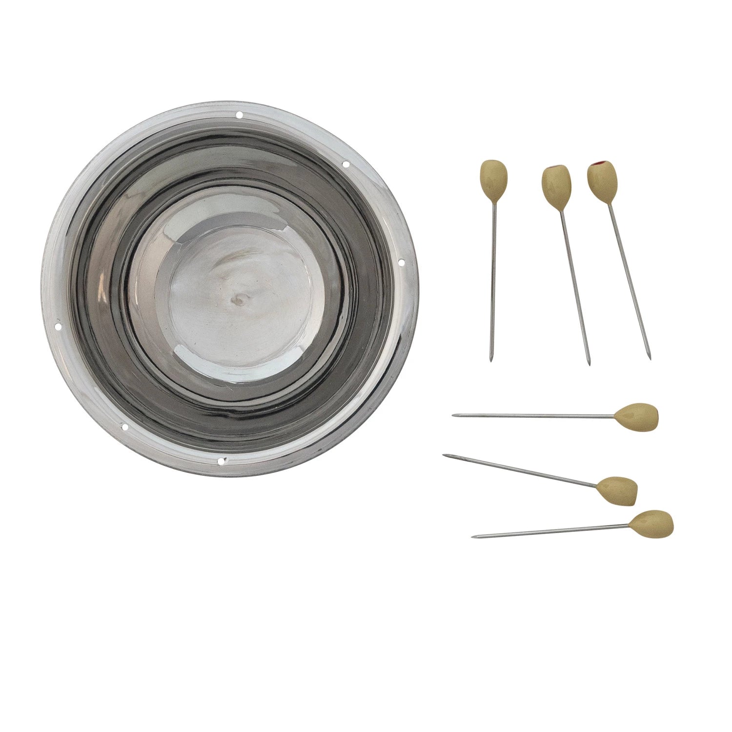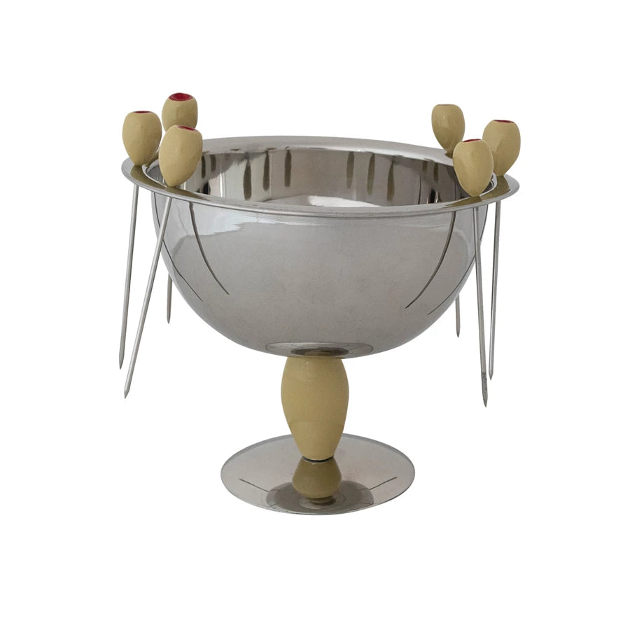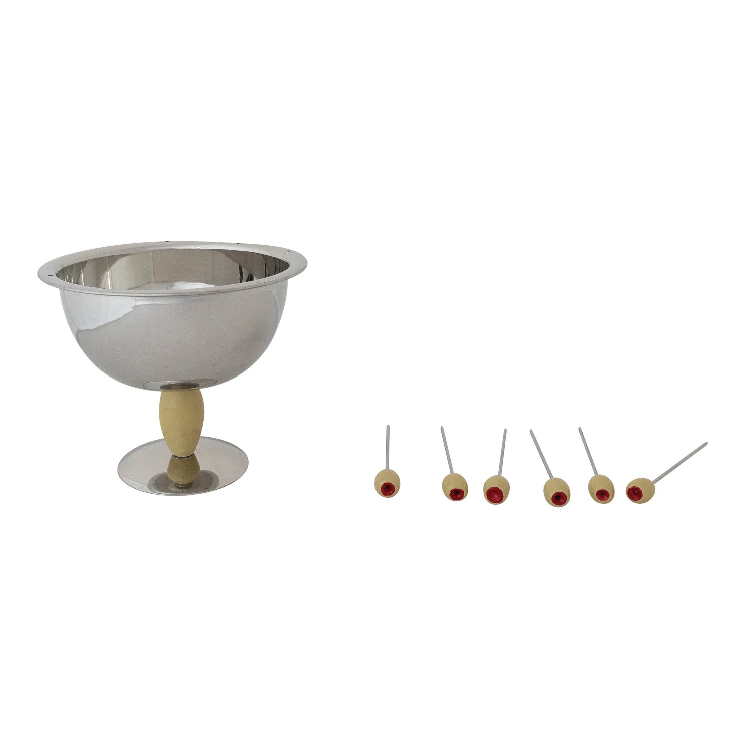 Elevate your appetizer presentation with this sophisticated seven-piece serving set. The 5-1/2" round footed bowl features vibrant green and red enamel detailing on durable stainless steel, providing an elegant centerpiece for your table. Six matching olive-shaped appetizer picks with 3-3/4" handles nestle perfectly along the rim, keeping your selections organized and accessible. Ideal for entertaining, this set combines functionality with refined aesthetics, making it an essential addition to any host's collection.