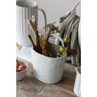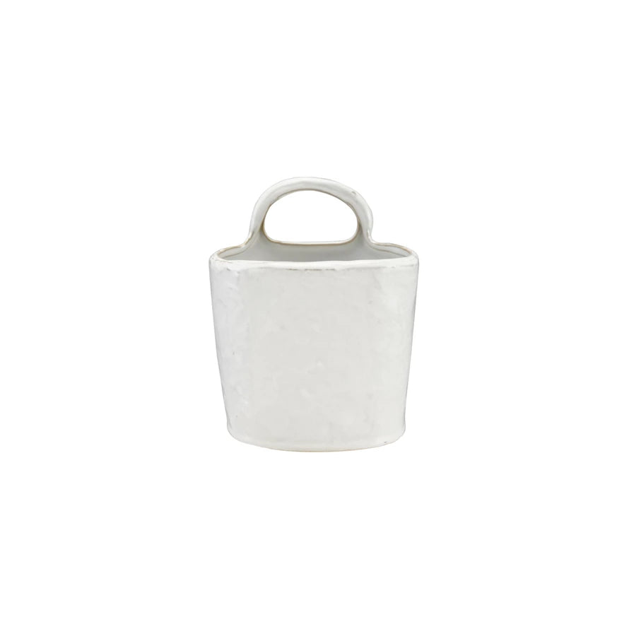 Handcrafted stoneware crock featuring a reactive glaze finish that creates unique variations in each piece. Measuring 6"L x 4-1/2"W x 7-1/4"H, this versatile vessel includes a sturdy handle for easy transport. The white glaze develops subtle color shifts during firing, ensuring no two crocks are identical. Ideal for storage, display, or serving, this durable piece brings artisanal character to any kitchen or table setting.