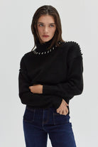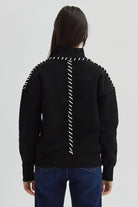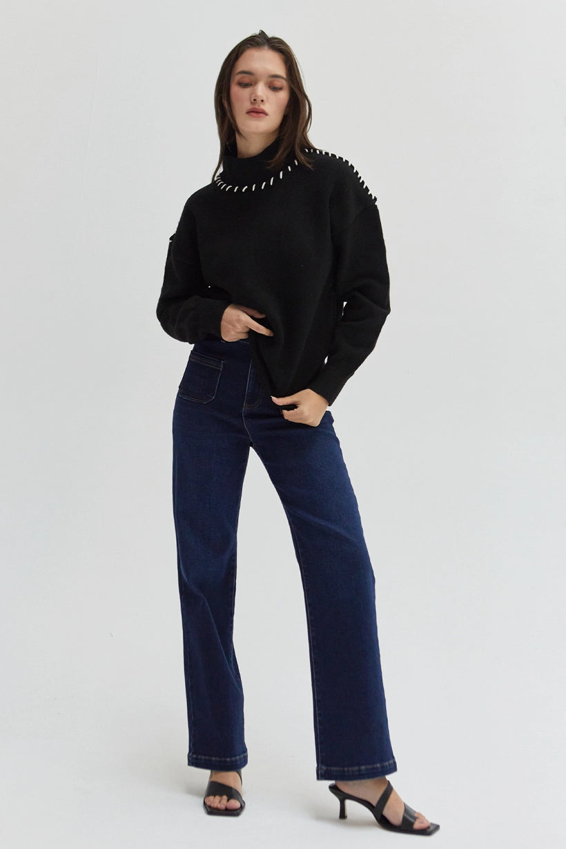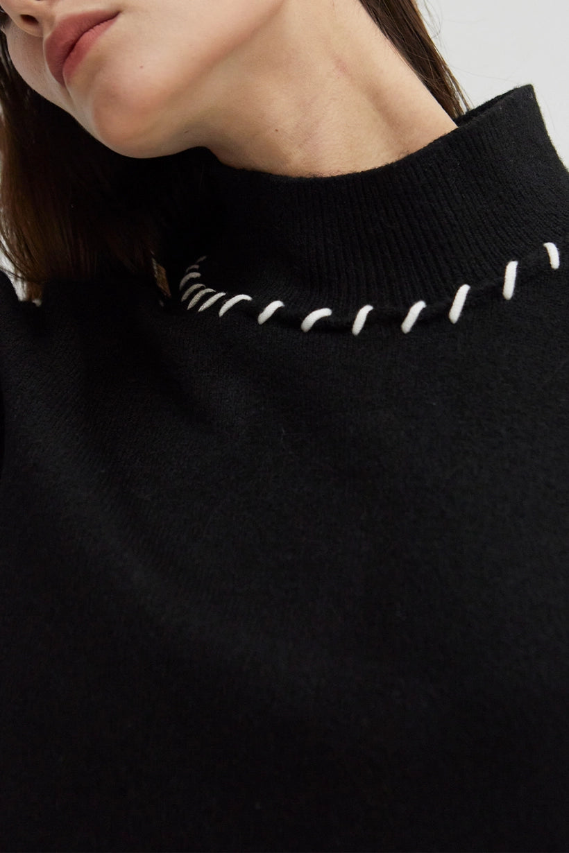 This relaxed-fit knit sweater features a mocked neck and sophisticated contrast thread detailing along the neck, shoulders, and back seam for visual interest. Crafted from quality knit fabric, it delivers effortless comfort with a contemporary silhouette that works seamlessly into any wardrobe. The thoughtful design elements elevate the piece while maintaining the ease of everyday wear.