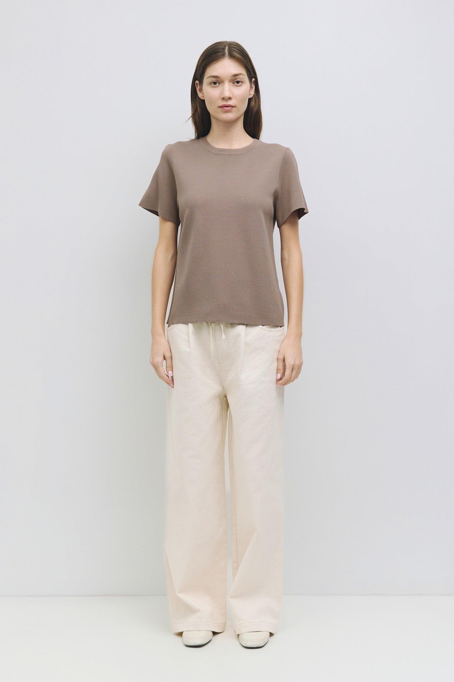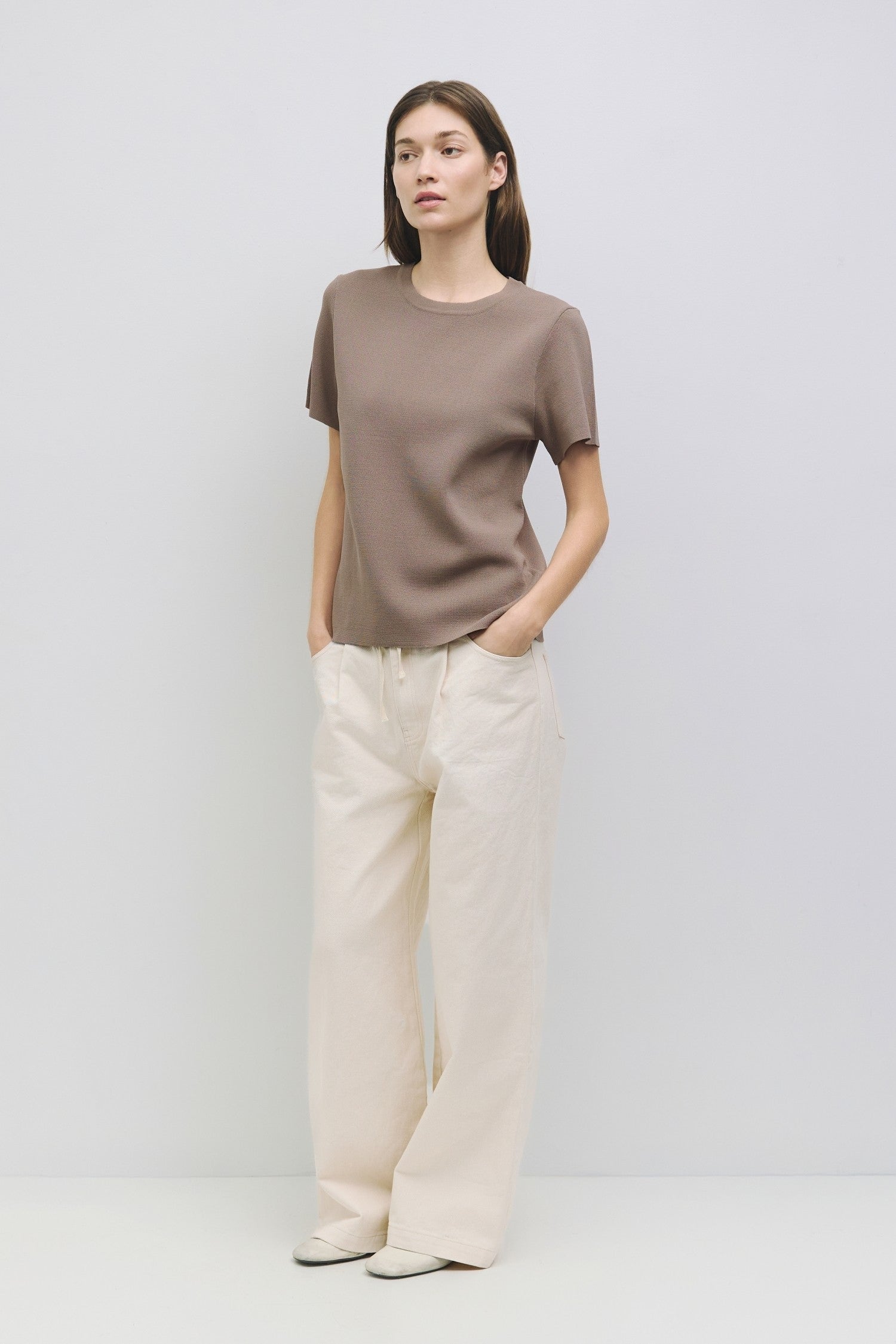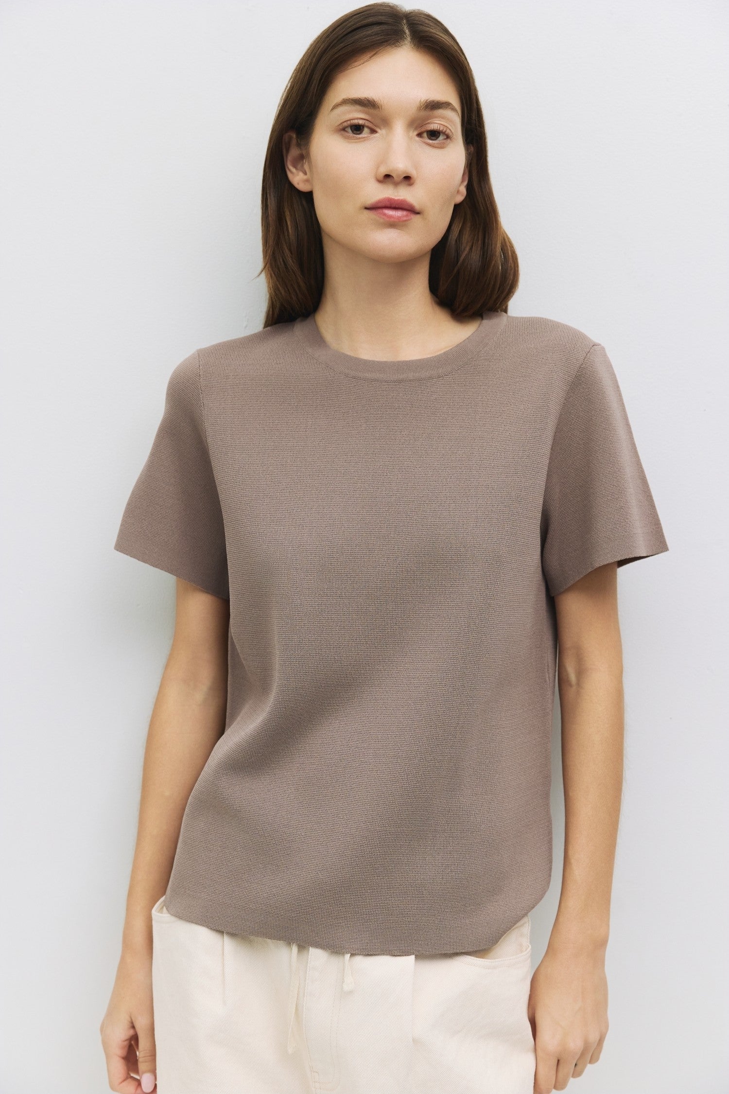 Upgrade your wardrobe with our Emma Knit Tshirt. This short-sleeve tee features a classic crew neck and ribbed band neckline for maximum comfort. The textured knitting adds a subtle design element for a refined and polished look. Elevate your style with this simple, yet sophisticated tshirt.