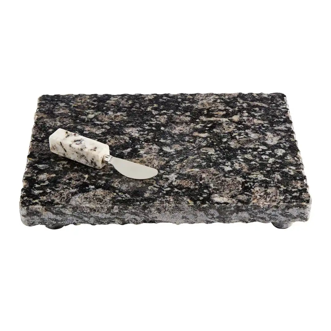 Take your cheese board to the next level with our footed black granite cheese board. The two piece set comes with a footed granite board. The board features a black granite pattern. The footed cheese board arrives with coordinating metal spreader that features a white granite handle and metal spreader.