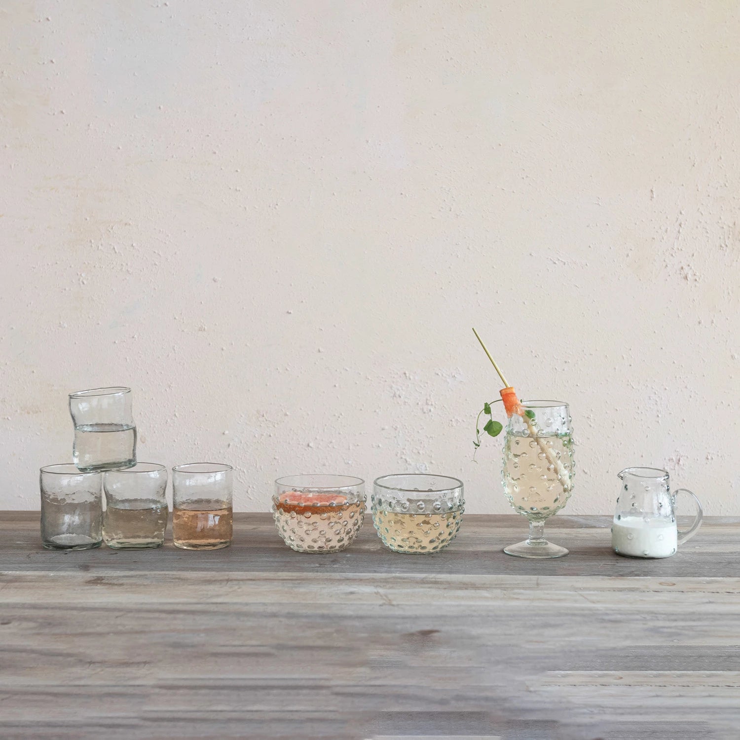 This reclaimed glass hobnail creamer is a charming and versatile serveware piece that can sweeten up any dining or living space. The creamer features a hobnail pattern that creates a subtle sparkle and a spout that makes it easy to pour. The clear glass material is made of reclaimed glass that is eco-friendly and unique. The creamer can be used as a creamer to add some cream to the coffee, tea, or hot chocolate, or as a decorative item to display on a shelf or table. The creamer measures 4 inches in length, 3 inches in width, and 3.75 inches in height, with a capacity of 8 ounces. It is a perfect choice for anyone who loves farmhouse, cottagecore, French country, or coastal style.