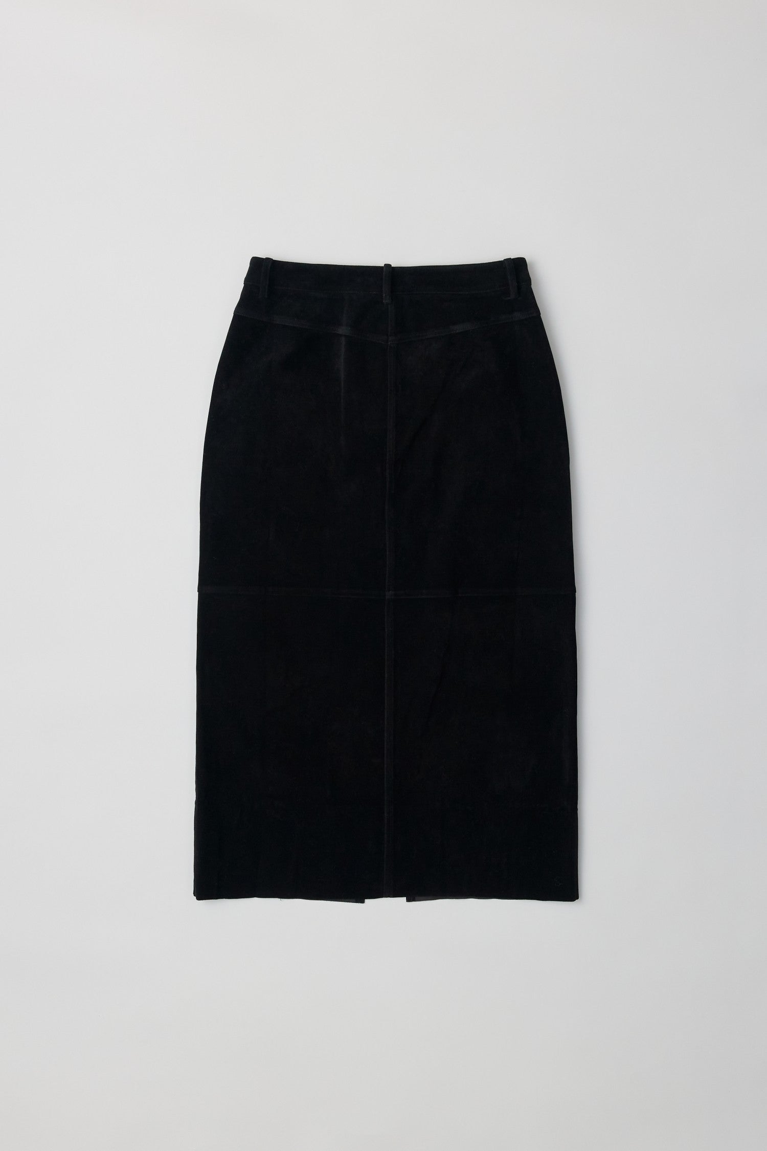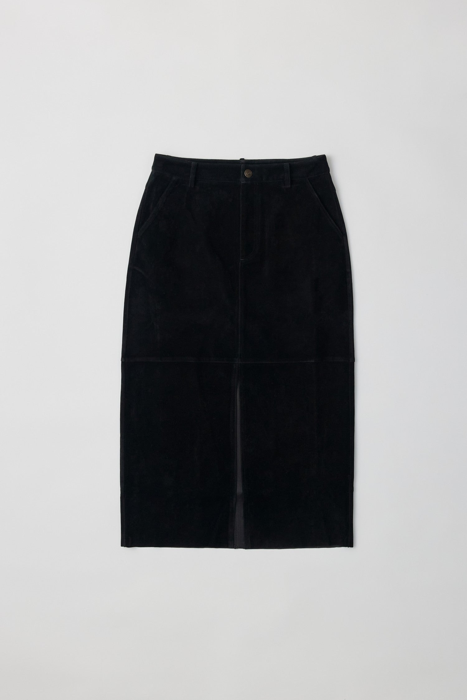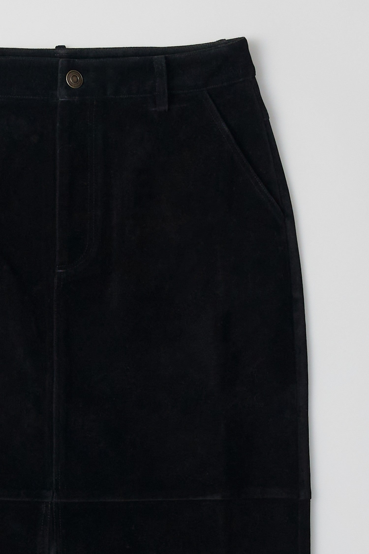 This faux suede midi skirt features a sleek H-line cut with a center front slit and side pockets for added practicality. The midi length provides versatility for any occasion, adding a touch of edge to your look.