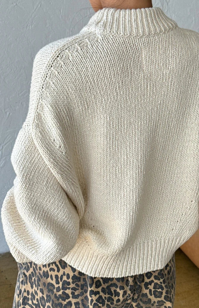 The Zoe Cotton Sweater - a timeless piece that transcends seasons. Made of mid-weight cotton and high gauge knit, it boasts a mock neck with slouchy shoulders and balloon sleeves for a relaxed fit. Ribbed trim adds a classic touch to the neck, cuffs, and hem. Layer the sweater over a cami during cooler moments, or on its own for an airy, elevated yet look.