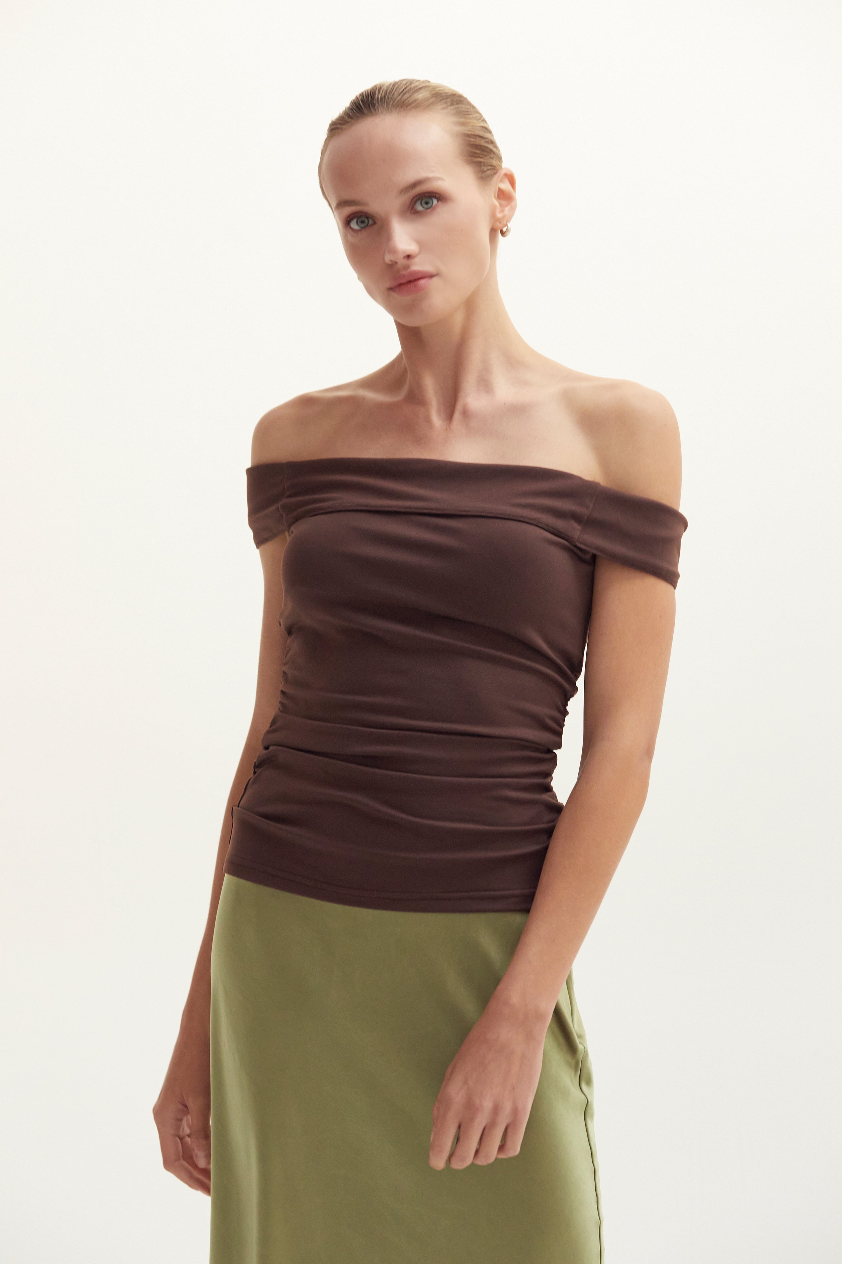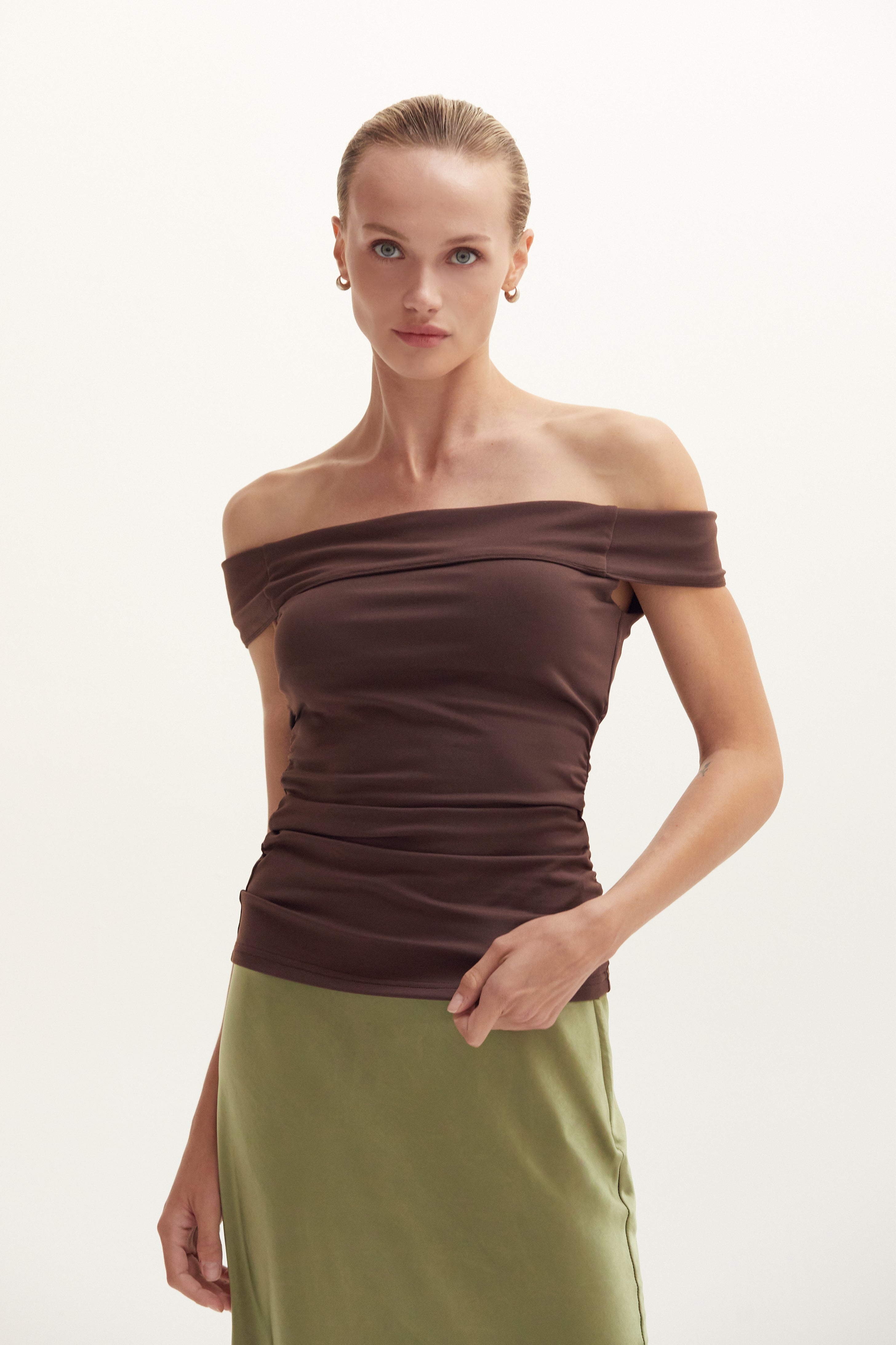 The Nora Top features a sophisticated off-the-shoulder design crafted from sculpted knit fabric, delivering both structure and comfort. Its tailored fit accentuates the neckline and shoulders for a refined silhouette, making it an ideal choice for elevated casual or evening wear. The high-quality knit ensures durability and a flattering shape that moves with you.