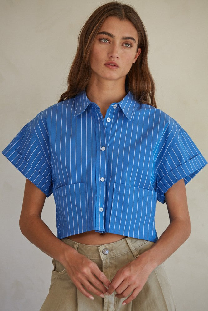Introducing the Sadie Blouse, crafted with a blend of cotton, nylon, and spandex for a comfortable and flattering fit. The striped pattern, button down collar, and short sleeves give this blouse a stylish look, while the pockets add functionality. Perfect for a casual day out or in the office.