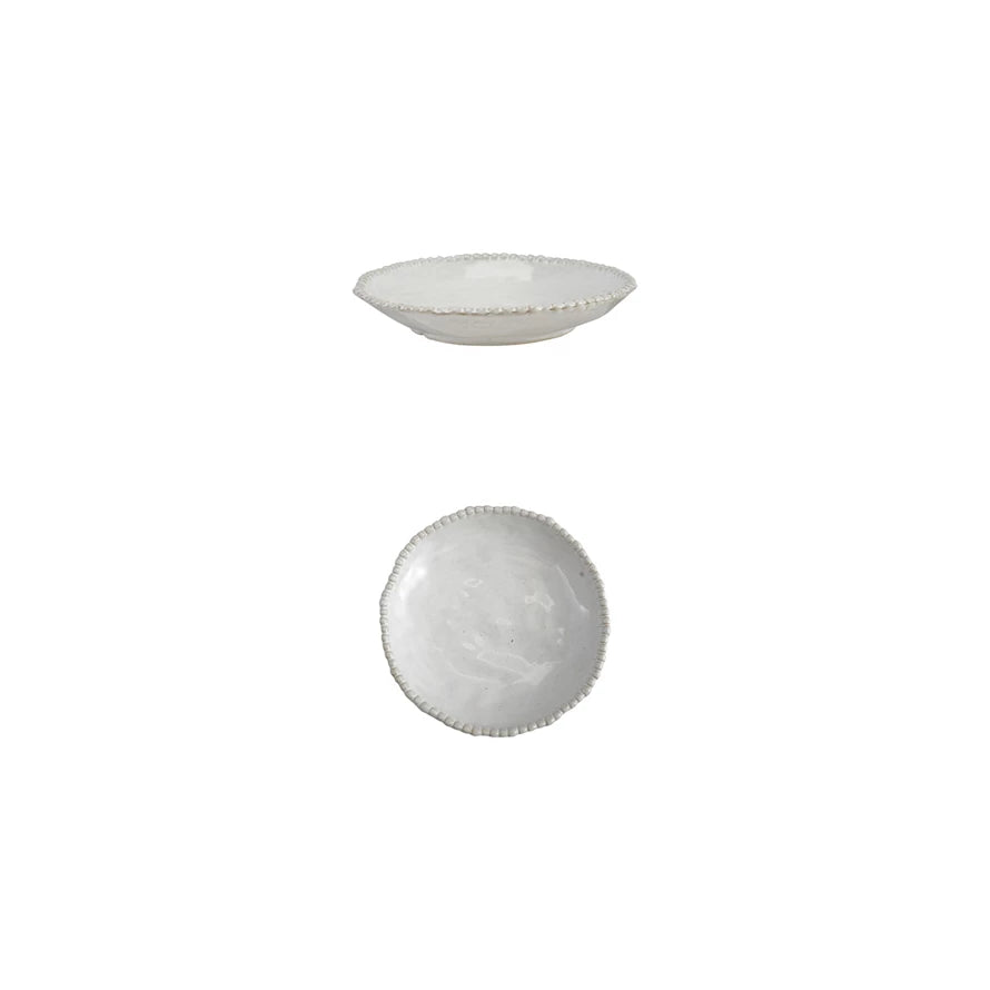 This handcrafted stoneware bowl features a distinctive hobnail rim that adds tactile interest and visual appeal to any table setting. The reactive glaze creates unique color variations, ensuring each piece is one-of-a-kind. At 8 inches in diameter with a low profile, it's perfectly suited for serving, displaying, or everyday use. The durable stoneware construction withstands regular use while developing character over time. Ideal for those who appreciate artisanal ceramics and the beauty of natural variation.