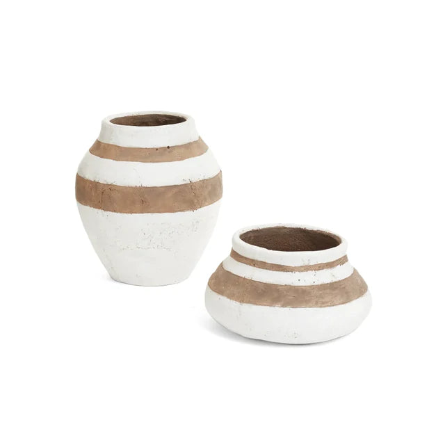 The Valeria Vase is a stylish two-tone home decor piece, with a white and natural ceramic finish. It comes in two stylish shapes, making it a perfect choice for shelving or table decor. Add a unique, decorative touch to any room with this vase.