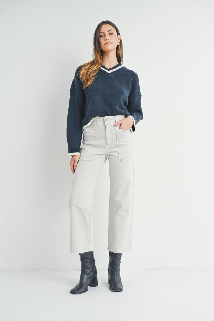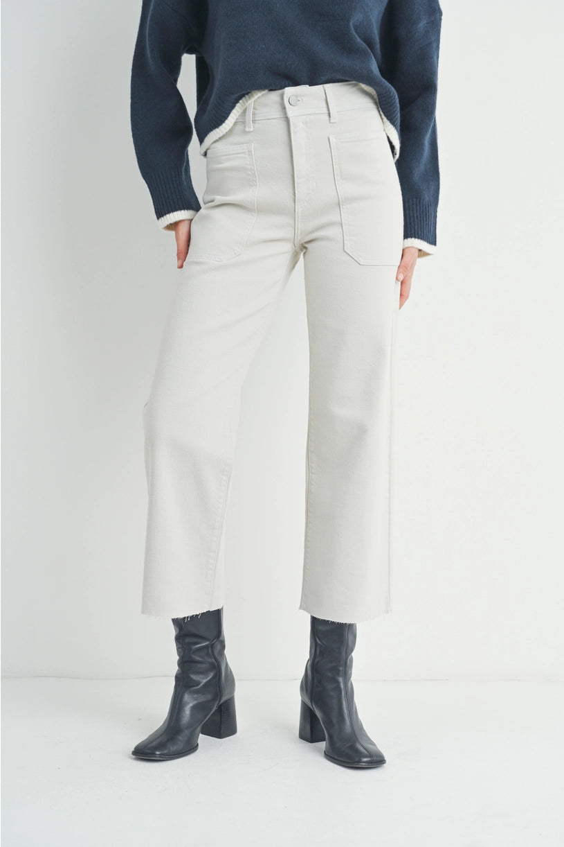 The Wren Sea Salt Denim features a high-rise, wide-leg silhouette crafted for both style and comfort. With an 11.5" rise, 27" inseam, and a 9.5" leg opening, these jeans offer a flattering fit that balances modern trends with timeless appeal. Functional front utility pockets provide ample space for essentials, combining practicality with a subtle statement. The soft creamy hue adds warmth and versatility, making these jeans a sophisticated addition to any wardrobe.