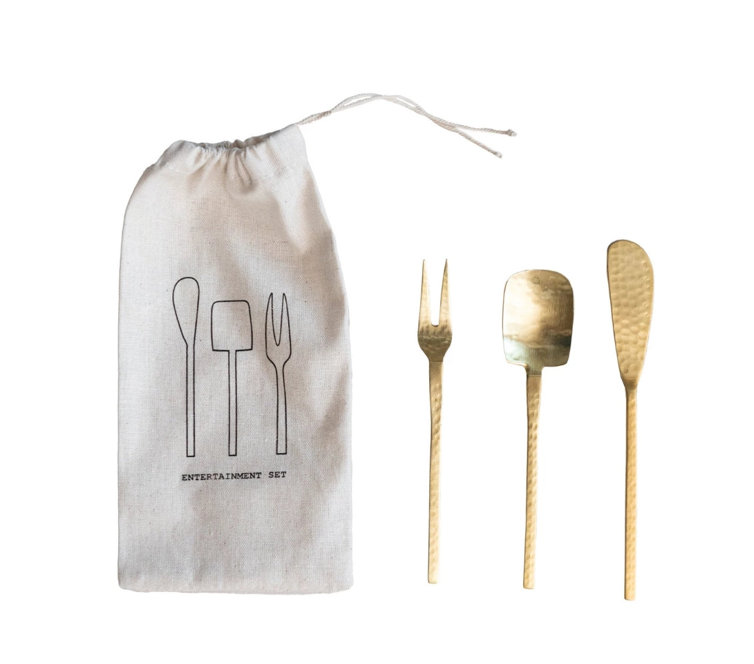 5-1/2"L - 6-1/4"L Hammered Stainless Steel Appetizer Utensils, Gold Finish, Set of 3 in Printed Drawstring Bag