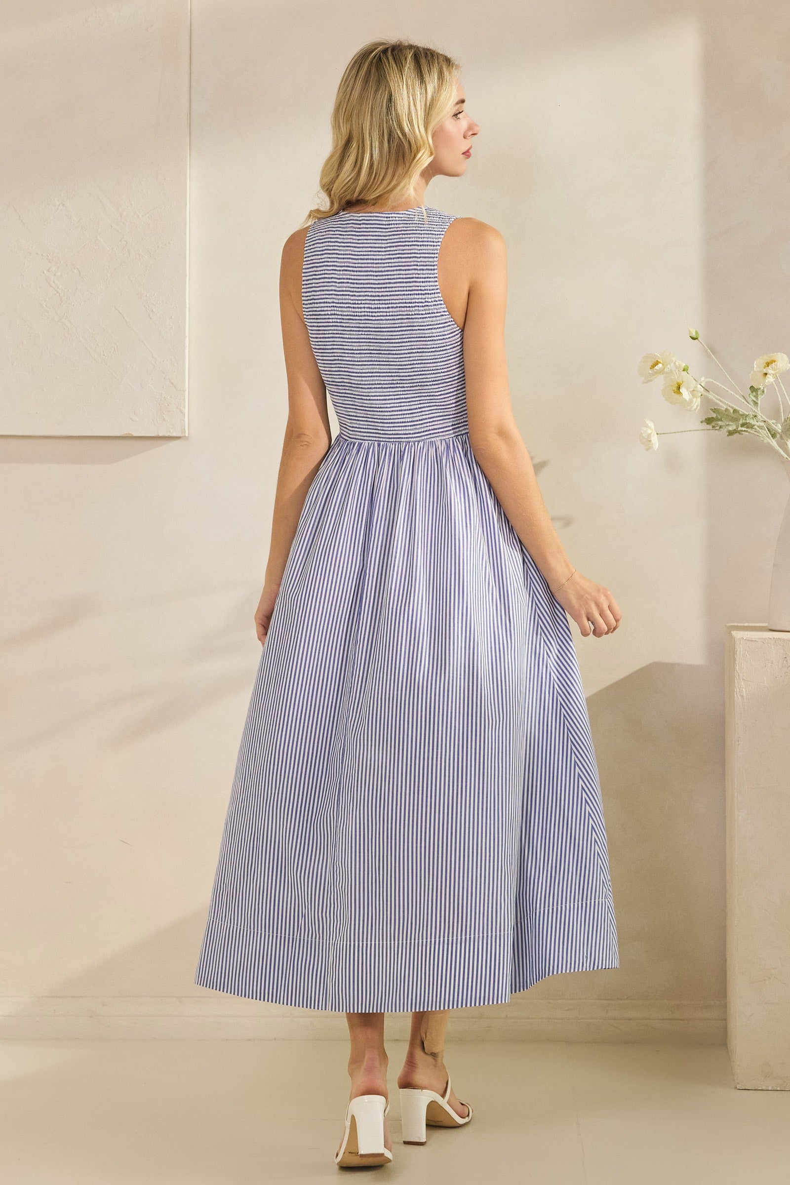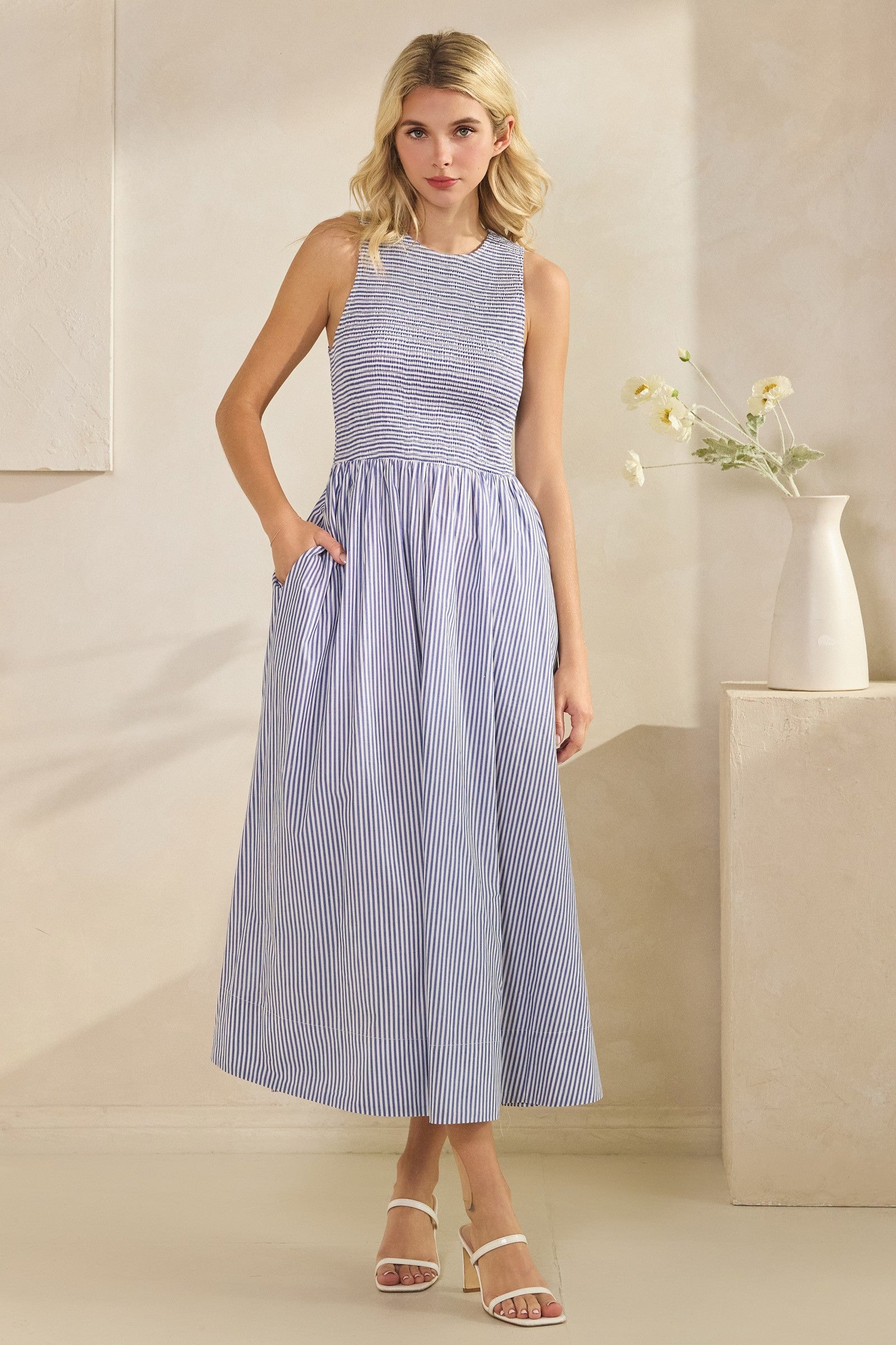Effortless elegance meets everyday comfort in this striped sleeveless maxi dress. The smocked bodice creates a flattering silhouette while the flowing skirt moves beautifully with you. Practical hidden pockets add functionality to this versatile piece—perfect for casual outings or dressed-up occasions. The timeless stripe pattern pairs easily with your favorite accessories, making it a wardrobe essential for any season.