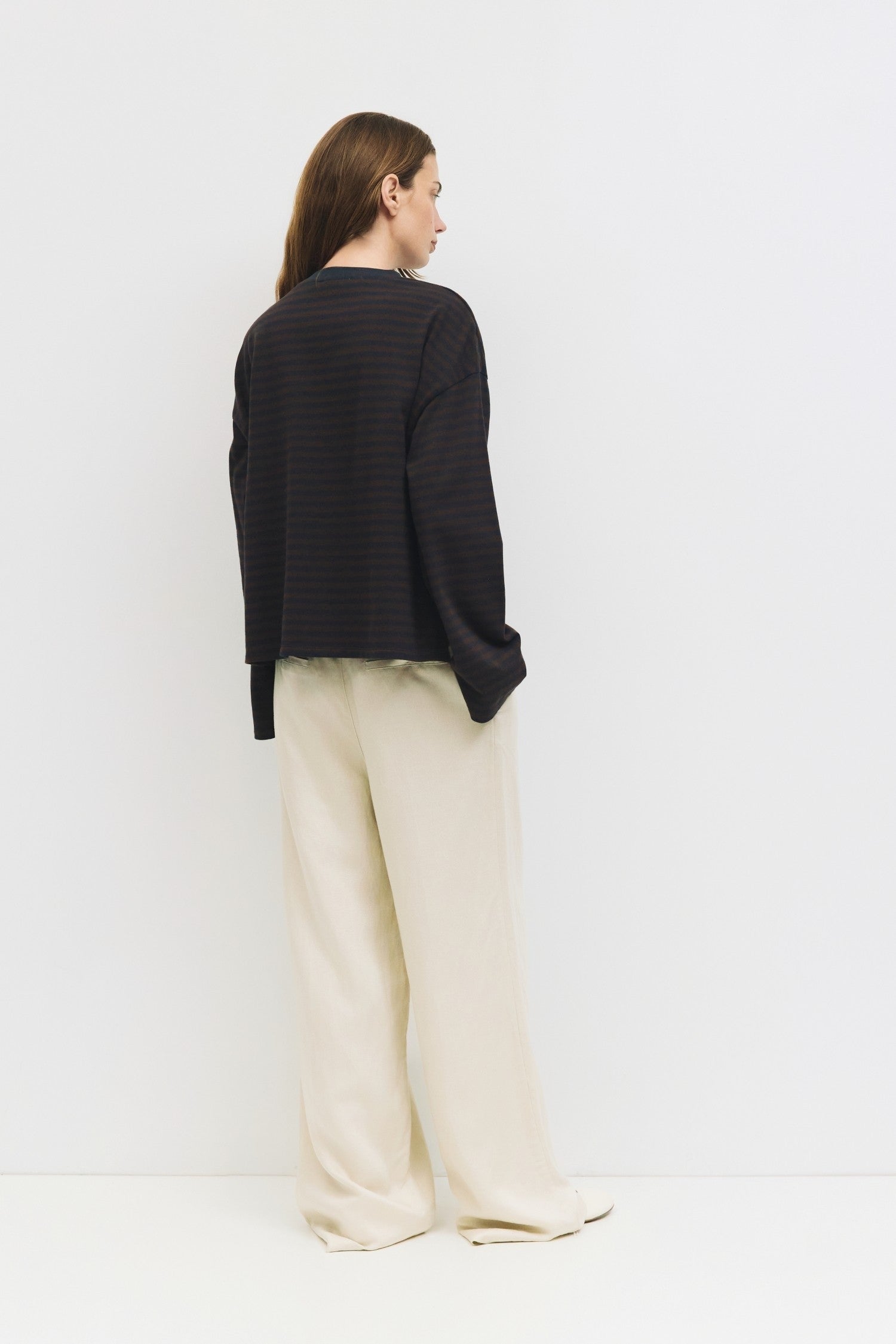 The Callie Top offers a relaxed fit crafted from midweight striped fabric, balancing comfort and style effortlessly. Its solid color crewneck and drop shoulder design enhance its casual appeal, making it ideal for layering or wearing solo. This versatile piece delivers both ease and a polished look for everyday wear.