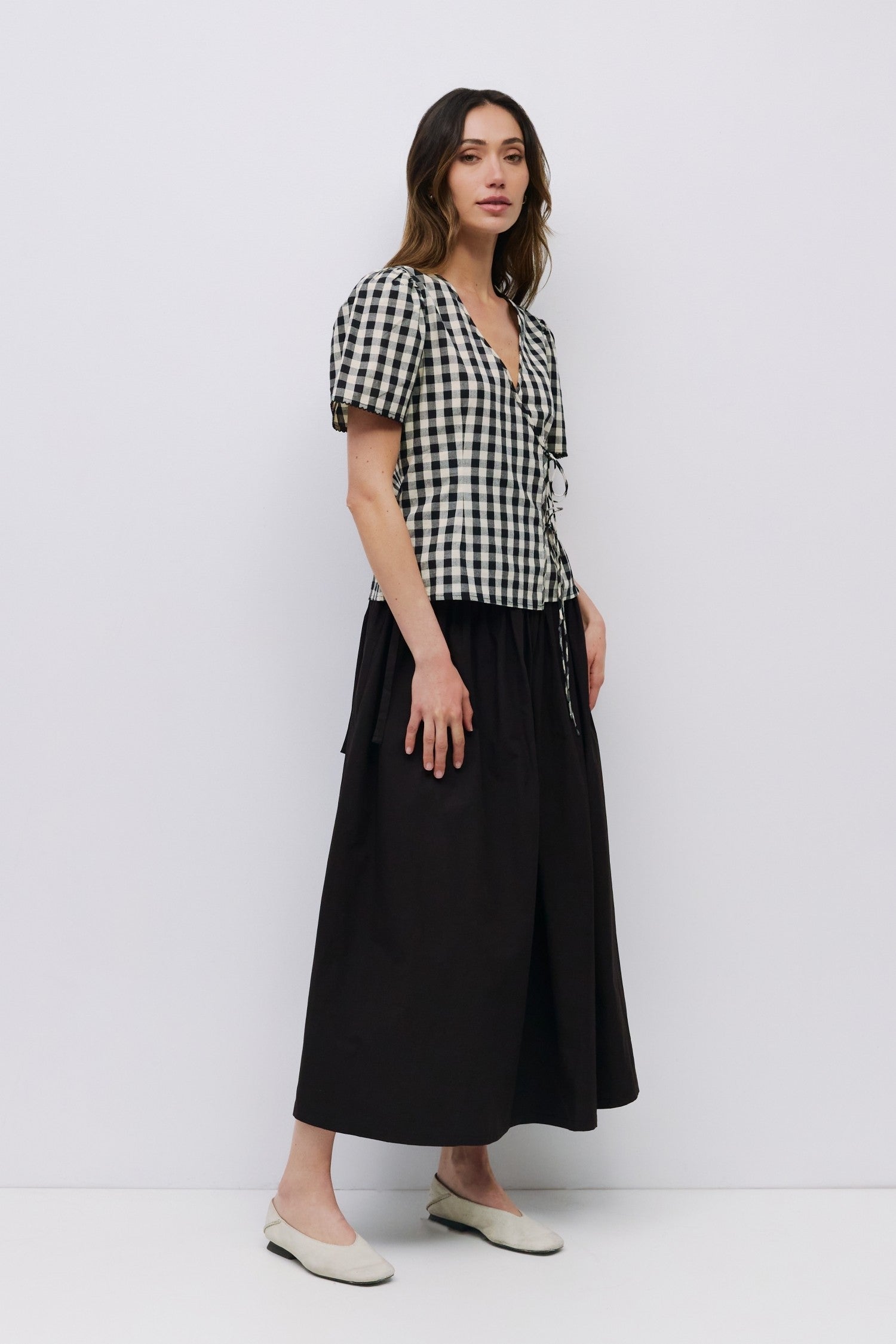 Expertly crafted, the Colleen Gingham Blouse combines style and versatility. This blouse features a flattering V-neck and cute puff sleeves with embroidered hems. Plus, the adjustable tie front allows for a customizable fit, adding a touch of feminine charm to your wardrobe.