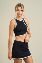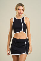 Elevate your athletic aesthetic with the Dawson Sport Set, a dynamic two-piece combining a fitted ribbed tank with striking contrast trim and an asymmetric hem. The coordinating high-rise mini skirt features matching contrast detailing and a curved edge for a polished, playful look. Built for comfort and confidence, this set delivers sporty-chic style that transitions seamlessly from gym to street.