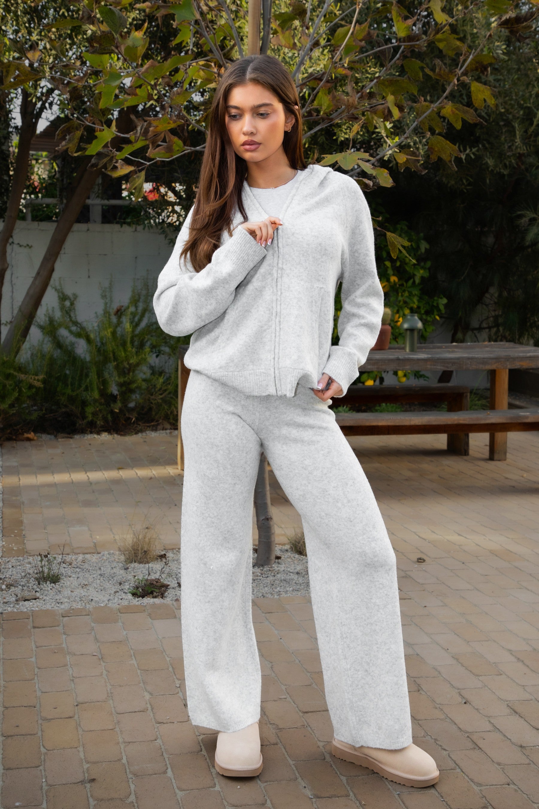 Embrace effortless comfort with these Dove Knit Sweatpants, crafted from soft sweater knit fabric that feels gentle against your skin. Featuring a mid-rise elastic waistband for a secure, flattering fit, these pants offer a relaxed wide-leg silhouette perfect for lounging or casual outings. The ribbed hem finish adds a polished touch while keeping the legs in place. Ideal for anyone seeking cozy style without compromising on ease.