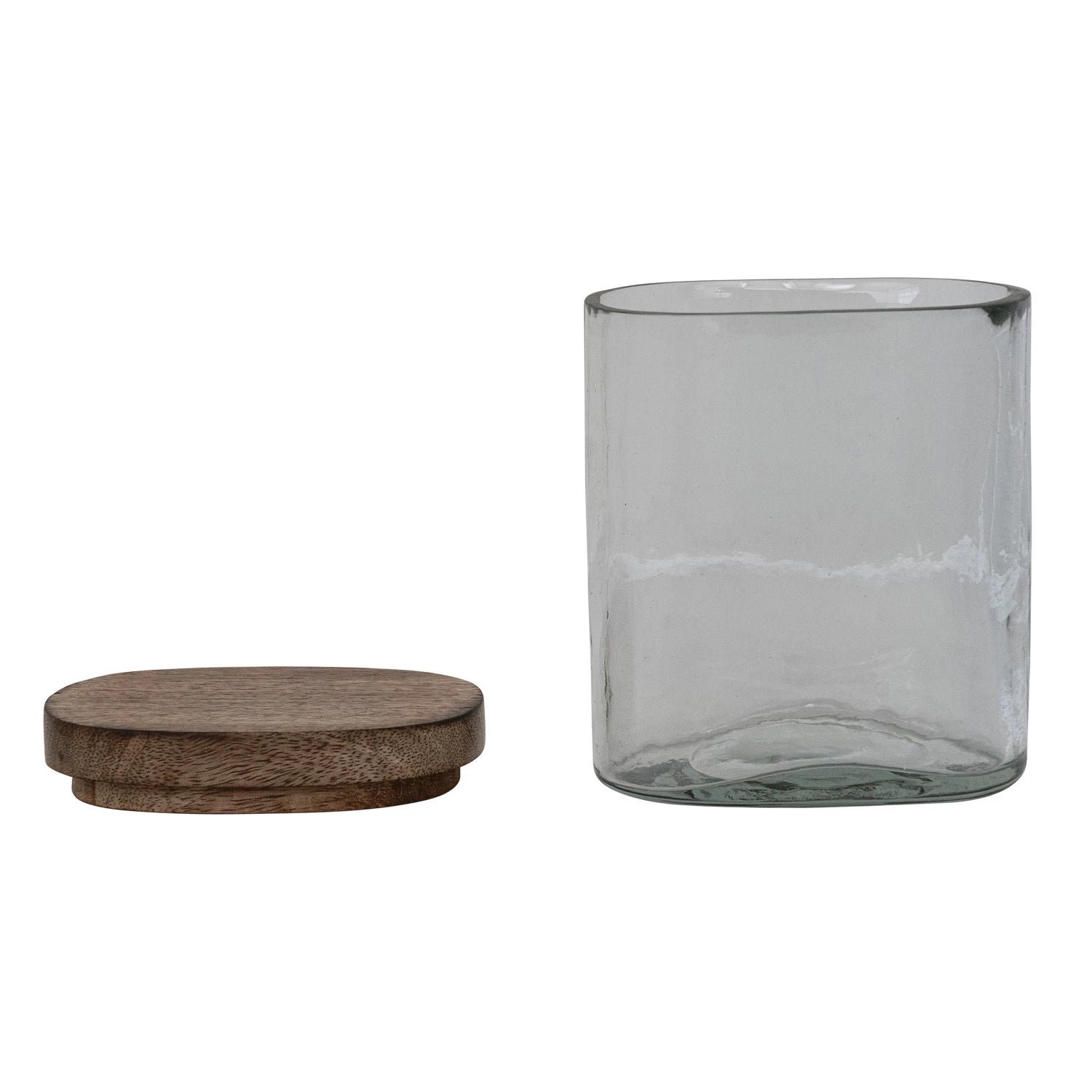 Artisan hand-blown glass jar crafted with organic irregularities that showcase traditional glassmaking techniques. The 14 oz capacity suits candles, storage, or display purposes. Natural mango wood lid provides a warm, sustainable closure that complements the glass vessel. Dimensions of 4"L x 3"W x 5"H make it a versatile accent piece for shelving or countertops. Each jar's unique variations in clarity and texture reflect its handmade origin, ensuring no two pieces are identical.