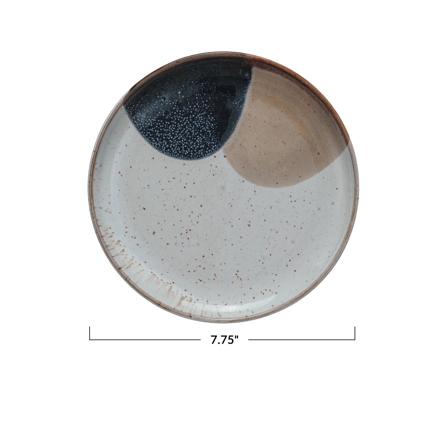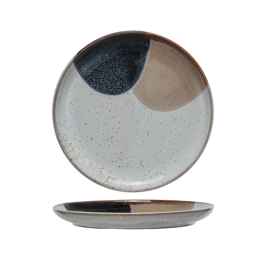 Expertly crafted with a reactive glaze finish, the Mosa plate features a unique blend of blue, tan, and white hues, making each piece one-of-a-kind. Made of durable stoneware, this 3/4" round plate adds a touch of artistic elegance to any table setting.